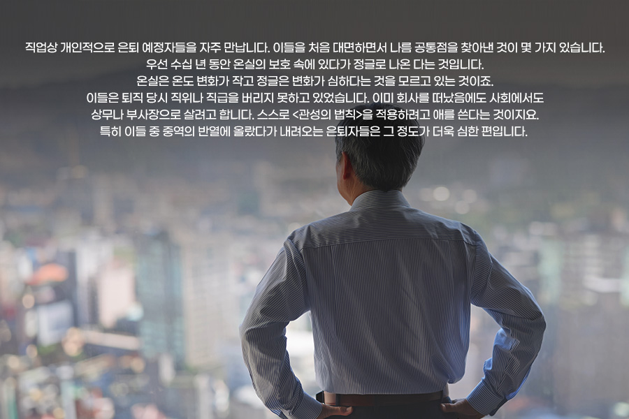 이들은 퇴직 당시 직위나 직급을 버리지 못하고 있었습니다. 이미 회사를 떠났음에도 사회에서도 상무나 부사장으로 살려고 합니다. 스스로 <관성의 법칙>을 적용하려고 애를 쓴다는 것이지요. 특히 이들 중 중역의 반열에 올랐다가 내려오는 은퇴자들은 그 정도가 더욱 심한 편입니다.