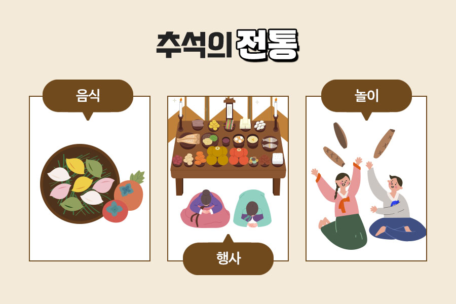 추석은 한국을 대표하는 명절인 만큼 다양한 음식과 놀이, 행사 등의 전통을 가지고 있습니다.