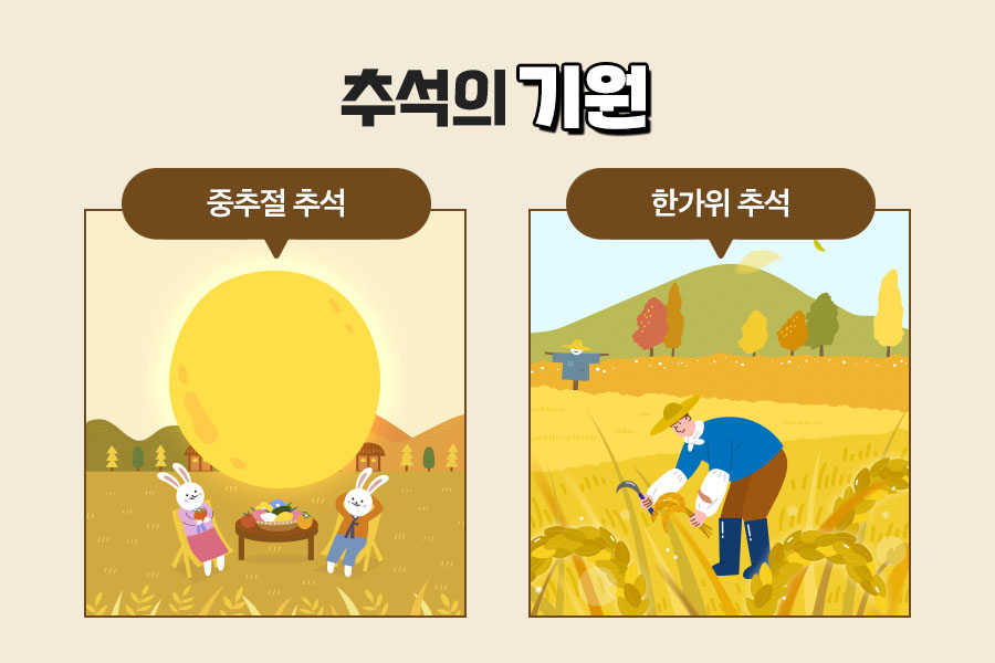 농경사회에서 수확의 기쁨을 나누고 조상에게 감사하는 의미의 명절로 우리가 흔히 알고 있는 추석의 유래이며 음력 8월 15일은 8월은 가을의 한가운데에 해당하므로 '가을의 한가운데 있는 저녁'이라는 뜻에서 '한가위'라고 불렸다는 설입니다.