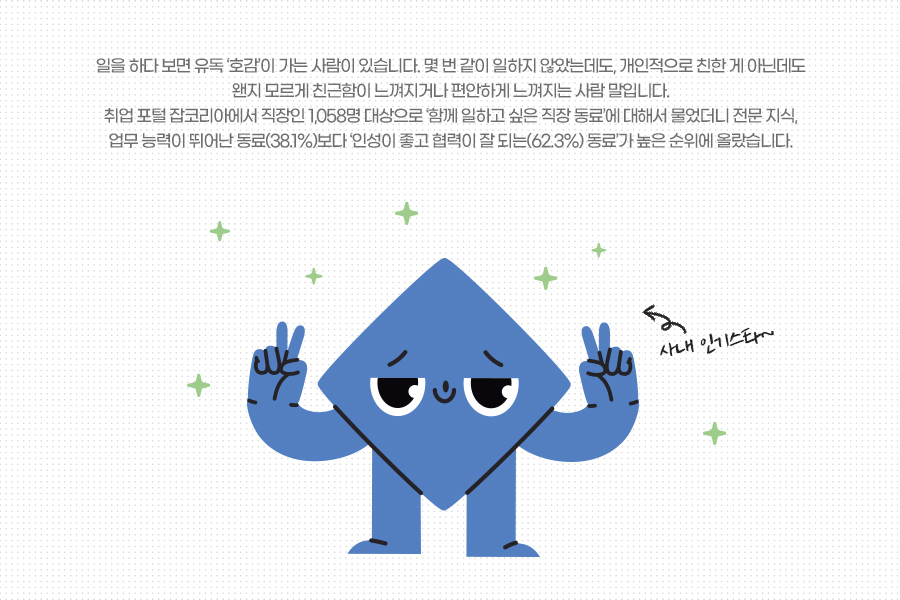 일을 하다 보면 유독 ‘호감’이 가는 사람이 있습니다. 몇 번 같이 일하지 않았는데도, 개인적으로 친한 게 아닌데도 왠지 모르게 친근함이 느껴지거나 편안하게 느껴지는 사람 말입니다. 취업 포털 잡코리아에서 직장인 1,058명 대상으로 ‘함께 일하고 싶은 직장 동료’에 대해서 물었더니 전문 지식, 업무 능력이 뛰어난 동료(38.1%)보다 ‘인성이 좋고 협력이 잘 되는(62.3%) 동료’가 높은 순위에 올랐습니다. ‘회사에서 일만 잘하면 되는 줄 알았더니 그게 아니었네요?’란 생각에 당황스러우신가요?