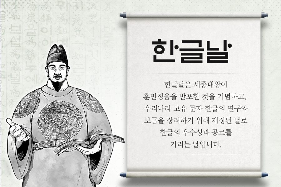 9월 말까지 기승을 부리던 더위가 물러가고, 선선한 바람이 부는 짧은 10월을 맞이하게 되었습니다. 10월은 선선한 가을 바람과 함께 여러 뜻깊은 날들이 있는 달인데요, 그중에서도 우리에게 없어서는 안 될 중요한 날이 있습니다. 바로 한글의 창제와 반포를 기념하기 위한 날, 한글날입니다. 올해 한글날은 한글 창제 578주년을 맞이하였습니다.