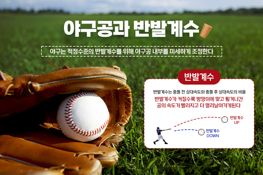 야구에는 발발계수라는 표현이 존재합니다. 야구에서 사용되는 '반발계수'는 충돌 전과 후의 상대 속도 비율을 의미합니다. 반발계수가 높을수록 배트에 맞은 공이 더 빠르게 튕겨 나가며, 더 멀리 날아가게 됩니다. 그래서 야구에서는 반발계수를 엄격하게 관리하며, 적정 수준의 반발계수를 유지하는 것을 중요하게 생각합니다. 이를 위해 야구공은 단단한 코르크 코어에 고무를 덧씌우고, 그 위에 털실을 감싼 후 면으로 마감합니다. 마지막으로 두 장의 가죽을 108번의 바느질로 이어 붙여 만들어집니다.