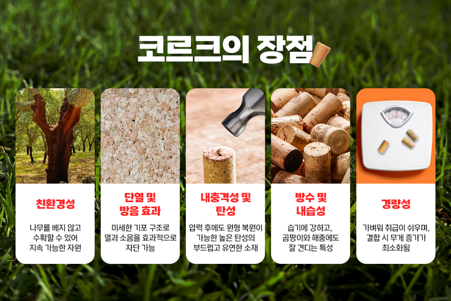 o 코르크는 천연 방수 특성이 있어 습기에 강하고, 곰팡이와 해충에도 잘 견디는 특성이 있습니다. 이로 인해 습도가 높은 환경에서도 안정적으로 사용할 수 있습니다.