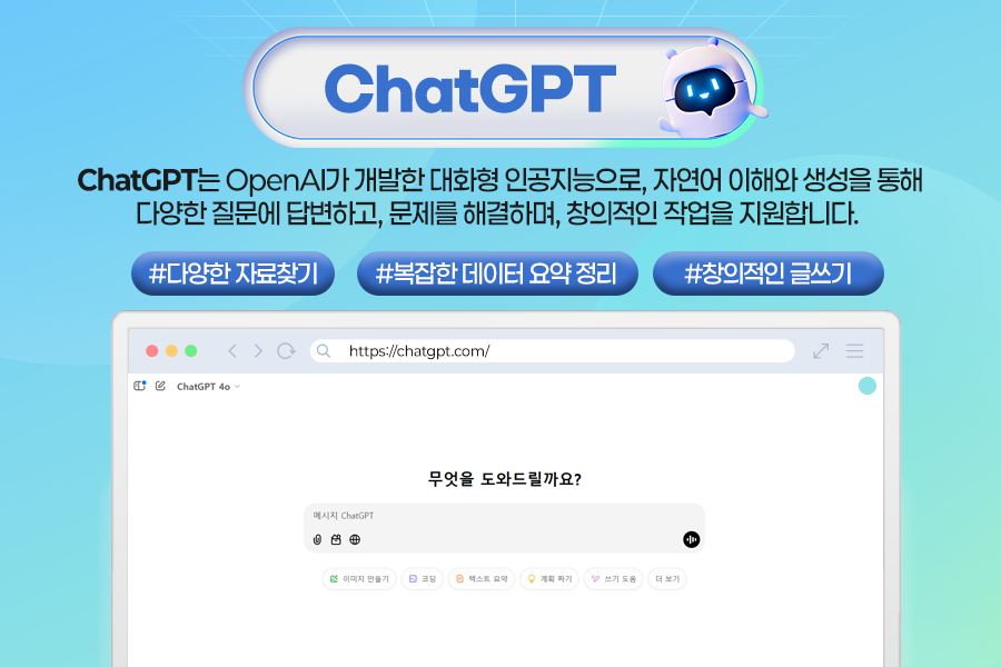 ChatGPT는 OpenAI가 개발한 대화형 인공지능으로, 자연어 이해와 생성을 통해 다양한 질문에 답변하고, 문제를 해결하며, 창의적인 작업을 지원합니다. 사용자와의 대화를 통해 맞춤형 정보를 제공하며, 텍스트 작성, 코드 작성, 학습 보조 등 여러 분야에서 유용하게 활용됩니다.