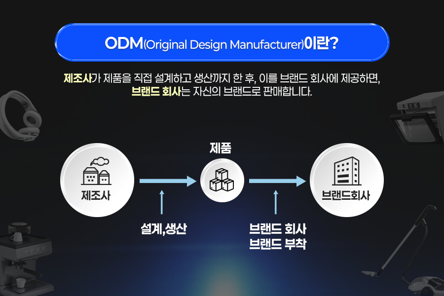 ODM은 '제조업자 설계 생산'을 의미하는데, 제조사가 제품을 직접 설계하고 생산까지 한 후, 이를 브랜드 회사에 제공하면, 브랜드 회사는 자신의 브랜드로 판매합니다. 브랜드 회사는 제품 설계에 크게 관여하지 않으며, 판매와 마케팅에 주력합니다.