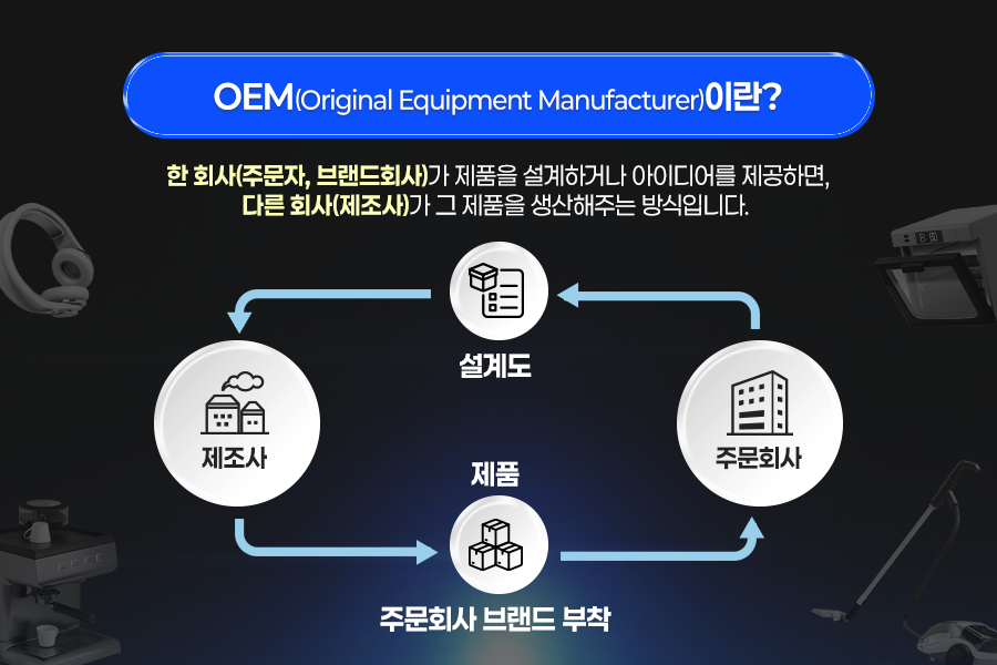 OEM은 '주문자 상표 부착 생산'을 의미하는데, 한 회사(주문자, 브랜드회사)가 제품을 설계하거나 아이디어를 제공하면, 다른 회사(제조사)가 그 제품을 생산해주는 방식입니다. 즉, 제품의 설계와 판매는 주문자(브랜드 회사)가 담당하고, 생산만 전문 제조사가 하는 구조입니다.