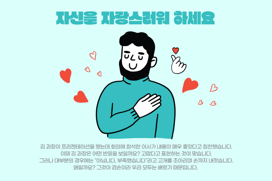 스스로를 자랑스럽게 여기는 것은 어려운 일이 아닙니다. 이렇듯 칭찬에 잘 대응하는 것 이외에도 아주 작은 성취감을 자주 느끼려는 노력도 효과적입니다. 딱 일주일 식단조절, 하루 10분 스트레칭도 좋아요. 그리고 결과에 대해 스스로를 칭찬해보세요. 이런 성취감을 자꾸 늘려가는 거에요. 이로써 자존감을 스스로 관리할 수 있어요. 회사에서 휘둘리지 않고 당당함을 유지할 수 있는 좋은 방법입니다.