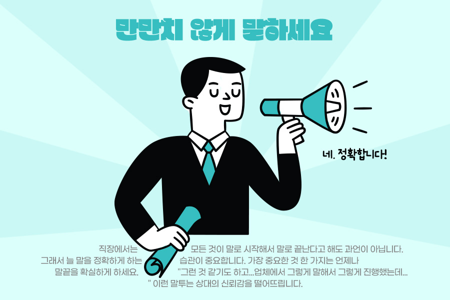 직장에서는 모든 것이 말로 시작해서 말로 끝난다고 해도 과언이 아닙니다. 그래서 늘 말을 정확하게 하는 습관이 중요합니다. 가장 중요한 것 한 가지는 언제나 말끝을 확실하게 하세요. "그런 것 같기도 하고...업체에서 그렇게 말해서 그렇게 진행했는데..." 이런 말투는 상대의 신뢰감을 떨어뜨립니다.