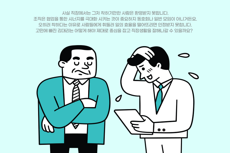 사실 직장에서는 그저 착하기만한 사람은 환영받지 못합니다. 조직은 협업을 통한 시너지를 극대화 시키는 것이 중요하지 동호회나 일반 모임이 아니거든요. 오히려 착하다는 이유로 사람들에게 휘둘려 일의 효율을 떨어뜨리면 인정받지 못합니다. 고민에 빠진 김대리는 어떻게 해야 제대로 중심을 잡고 직장생활을 잘해나갈 수 있을까요?