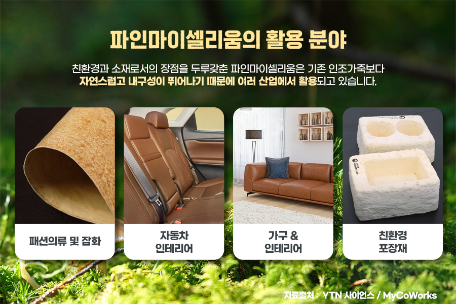 친환경과 소재로서의 장점을 두루갖춘 파인마이셀리움은 기존 인조가죽보다 자연스럽고 내구성이 뛰어나기 때문에 여러 산업에서 활용되고 있습니다.