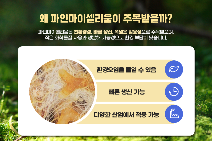 파인마이셀리움은 친환경성, 빠른 생산, 폭넓은 활용성 때문에 주목받습니다. 기존 동물 가죽과 달리 물과 화학물질 사용이 적고 생분해 가능해 환경 부담이 낮아 주목받고 있습니다.