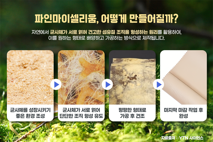 이렇게 만들어진 파인마이셀리움은 동물 가죽과 거의 비슷한 촉감과 질감을 가지면서도, 가죽 생산 과정에서 발생하는 환경 문제를 대폭 줄일 수 있는 친환경 대체 소재가 됩니다.