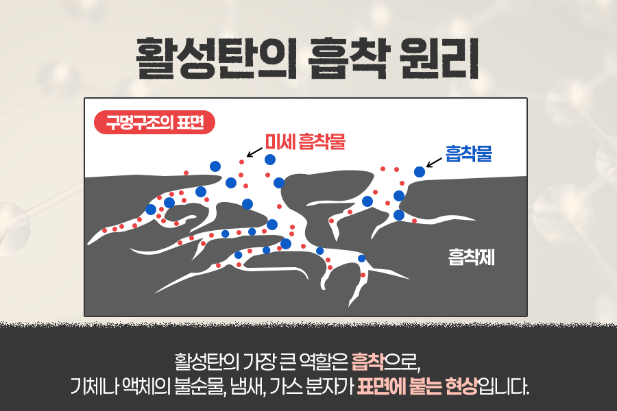 그렇다면 활성탄이 필터로서 가장 효과적인 원리는 무엇일까요? 활성탄의 가장 큰 역할은 바로 흡착입니다. 흡착은 기체나 액체 속에 떠다니는 불순물, 냄새, 가스 분자 등이 활성탄 표면에 붙는 현상인데요.