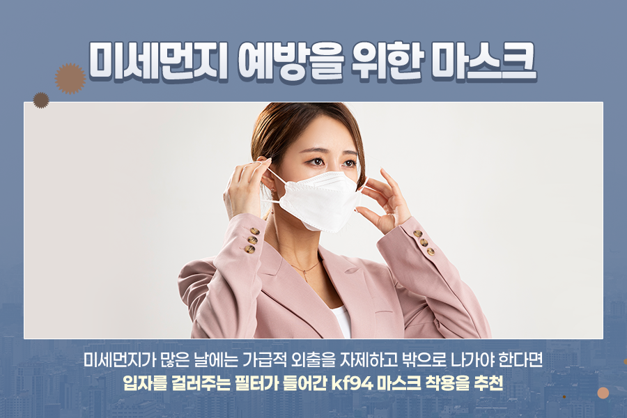 미세먼지가 많은 날에는 예방하는 것 또한 중요한데요. 가급적 외출을 자제하고 피치 못하게 나갈 일정이 생긴다면 마스크를 착용하는 것이 좋습니다. 마스크는 일반 마스크가 아닌 필터가 들어가 입자를 걸러줄 수 있는 kf94 마스크를 추천합니다. 또한 외출 후엔 깨끗이 손을 씻는 게 중요하죠.