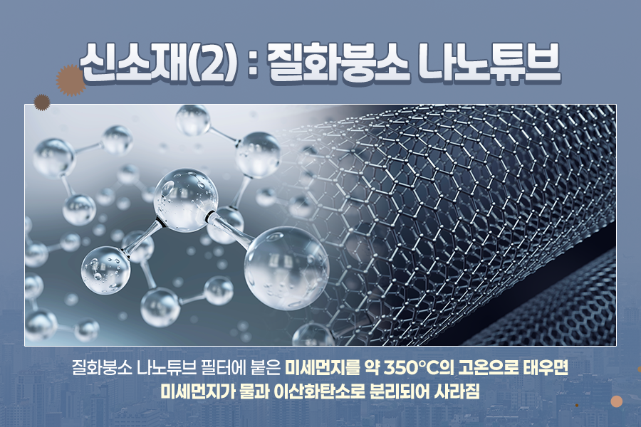 또한 질화붕소 나노튜브를 이용한 첨단 미세먼지 필터로도 미세먼지를 줄일 수 있다고 하는데요. 약 350°C 이상의 고온으로 미세먼지를 태우면 미세먼지는 물과 이산화탄소로 분리되어 사라집니다. 이 질화붕소 나노튜브 필터는 약 900°C까지 견딜 수 있어 필터에 붙은 미세먼지를 태울 때 필터를 이용하면 된다고 하죠. 그리고 필터는 재활용도 가능해 환경적으로도 좋습니다.