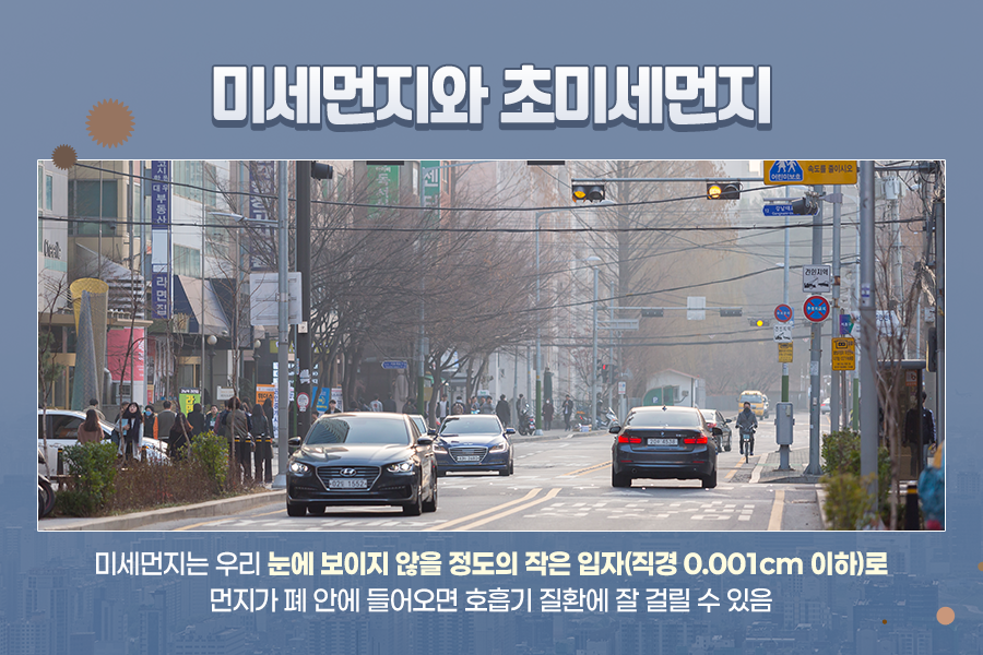 미세먼지는 우리 눈에 보이지 않을 정도로 작은 먼지 입자(직경 0.001cm 이하)를 말합니다. 초미세먼지는 이보다 더 작은데요. 이런 먼지는 작아서 우리가 숨을 쉴 때 폐 안까지 바로 들어올 수 있다고 합니다.