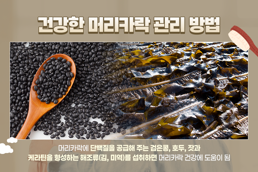 그렇다면 우리는 어떻게 검정색 머리카락을 오래 유지할 수 있을까요? 머리카락에 단백질을 줄 수 있는 검은콩, 호두, 잣과 같은 견과류를 섭취하는 것을 추천합니다. 그리고 케라틴을 형성하는데 도움이 되는 해조류(김, 미역 등)도 머리카락 건강에 좋다고 하죠.