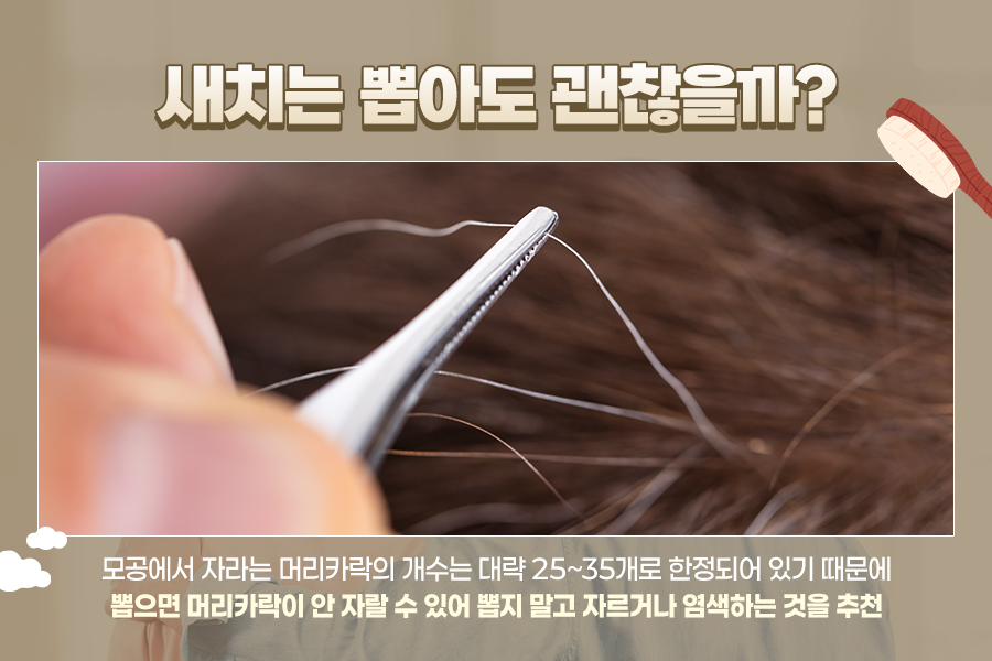 나이가 어릴 때 나는 흰머리를 우리는 흔히 새치라고 부르는데요. 새치는 뽑지 말고 자르거나 염색을 해서 색깔을 가리는 게 낫다고 합니다. 모공에서 자라는 머리카락의 개수가 대략 25~35개로 정해져있기 때문인데요.