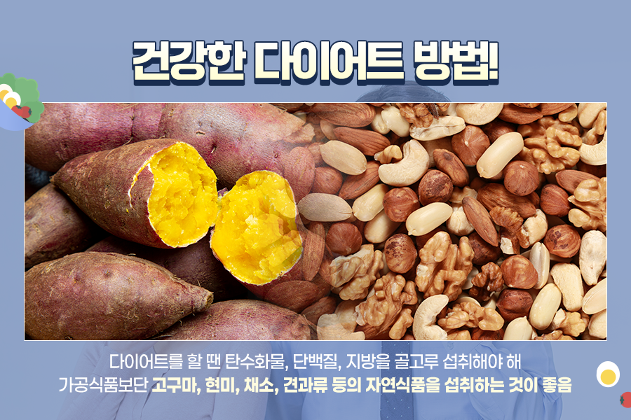 가공식품보단 고구마, 현미, 채소, 견과류와 같은 자연식품 위주로 섭취하는 것이 좋습니다. 또한 운동도 중요한데요. 유산소 운동과 무산소 운동을 병행하며 관리하는 게 근육을 유지하면서 체지방을 감소하는 데 도움됩니다. 그리고 수시로 수분 보충하는 것도 잊지 마세요!