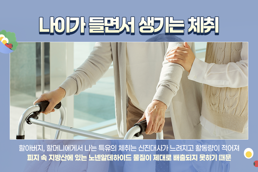 할아버지, 할머니에게서 나는 특유의 체취가 있죠. 그 체취도 바로 피지 속 지방산이 원인입니다. 지방산엔 '노넨알데하이드'라는 물질이 있는데요. 나이가 들며 신진대사가 느려지고 활동량이 줄어들면 이 물질이 제대로 배출되지 못해 특유의 체취로 이어지게 된다고 합니다.