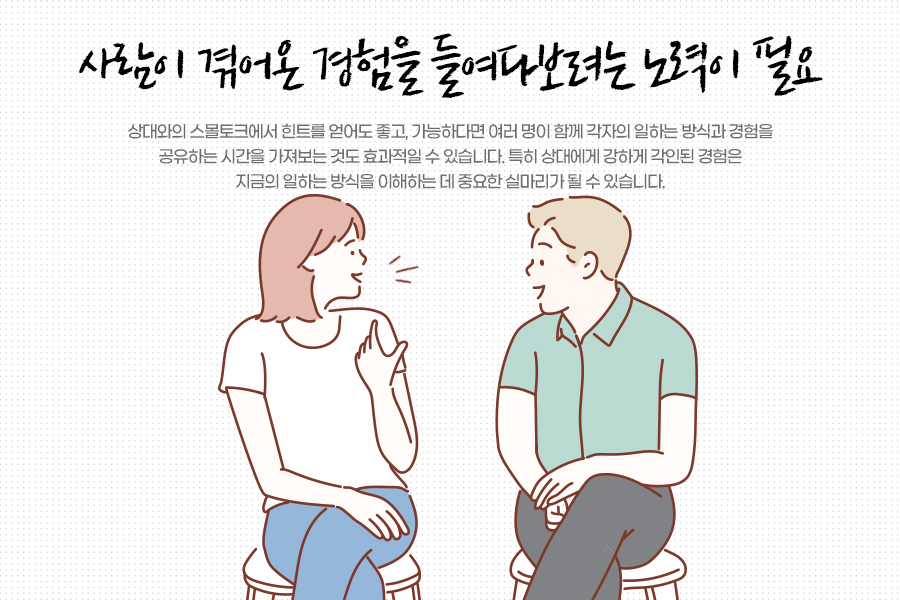 우리가 각자 가진 ‘일하는 방식’은 우연히 생긴 것이 아닙니다. 성과를 냈던 경험, 실수 후 피드백 받았던 경험, 인정받았던 경험 등 다양한 경험이 차곡차곡 쌓여서 ‘지금의 나’를 만든 거니까요. 그래서 다른 사람을 이해하기 위해서는 그 사람이 겪어온 경험을 들여다보려는 노력이 필요합니다. 상대와의 스몰토크에서 힌트를 얻어도 좋고, 가능하다면 여러 명이 함께 각자의 일하는 방식과 경험을 공유하는 시간을 가져보는 것도 효과적일 수 있습니다. 특히 상대에게 강하게 각인된 경험은 지금의 일하는 방식을 이해하는 데 중요한 실마리가 될 수 있습니다. 조직에서 크게 인정받았던 일이나, 처음 겪은 실패처럼 감정이 깊게 남은 순간일수록 개인의 업무 방식이나 태도에 큰 영향을 미치니까요.
