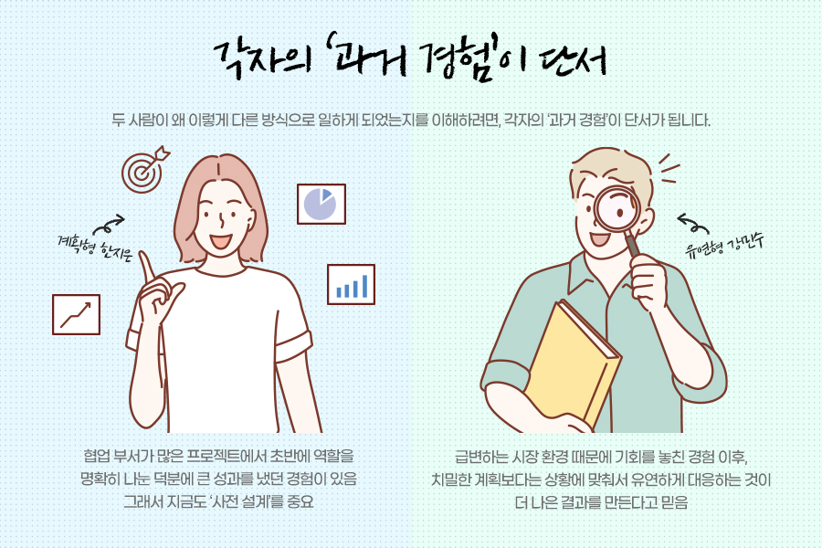 반면 강민수님은 급변하는 시장 환경 때문에 기회를 놓친 경험 이후, 치밀한 계획보다는 상황에 맞춰서 유연하게 대응하는 것이 더 나은 결과를 만든다고 믿게 되었습니다. 만약 두 사람이 이런 맥락을 서로 알고 있었다면, 상대방의 일하는 방식을 조금 더 쉽게 포용할 수 있지 않았을까요?