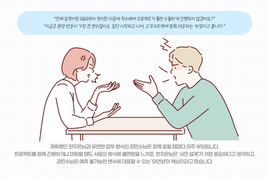 계획형인 한지은님과 유연한 업무 방식의 강민수님은 함께 일할 때마다 자주 부딪힙니다. 프로젝트를 함께 진행하거나 미팅할 때도 서로의 방식에 불편함을 느끼죠. 한지은님은 ‘사전 설계’가 가장 중요하다고 생각하고, 강민수님은 예측 불가능한 변수에 대응할 수 있는 ‘유연성’이 핵심이라고 믿습니다.