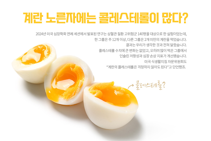 그런데 “계란 노른자에는 콜레스테롤이 많다”라는 말을 한 번쯤 들어보셨을 겁니다. 하지만 이러한 오해는 최근 연구 결과를 통해 풀리게 되었습니다. 2024년 미국 심장학회 연례 세션에서 발표된 연구는 심혈관 질환 고위험군 140명을 대상으로 한 실험이었는데, 한 그룹은 주 12개 이상, 다른 그룹은 2개 미만의 계란을 먹었습니다. 결과는 우리가 생각한 것과 전혀 달랐습니다. 콜레스테롤 수치에 큰 변화는 없었고, 오히려 많이 먹은 그룹에서 인슐린 저항성과 심장 손상 지표가 개선됐습니다. 미국 식생활지침 자문위원회도 “계란의 콜레스테롤은 걱정하지 않아도 된다”고 단언했죠. 그러니 여러분들은 하루 두 개, 마음 편히 즐기셔도 될 것 같습니다.