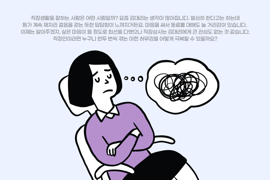 직장생활을 잘하는 사람은 어떤 사람일까? 요즘 김대리는 생각이 많아집니다. 열심히 한다고는 하는데 뭔가 계속 제자리 걸음을 걷는 듯한 답답함이 느껴지거든요. 마음을 써서 동료를 대해도 늘 거리감이 있습니다. 이제는 알아주겠지, 싶은 마음이 들 정도로 최선을 다했으나 직장상사는 김대리에게 큰 관심도 없는 것 같습니다. 이대로 직장생활을 계속한들 세월만 보내고 그저 그런 직장인으로 도태되는 것이 아닐까, 불안감도 스멀스멀 올라옵니다. 직장인이라면 누구나 한두 번씩 겪는 이런 허무감을 어떻게 극복할 수 있을까요?