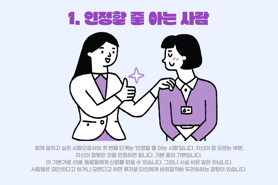 함께 일하고 싶은 사람으로서의 첫 번째 단계는 '인정할 줄 아는 사람'입니다. 무엇을 인정 해야 할까요? 자신이 잘 모르는 부분, 자신이 잘못한 것을 인정하면 됩니다. 기본 중의 기본입니다. 이 기본기로 선배, 동료들에게 신뢰를 얻을 수 있습니다. 그러나 사실 쉬운 일은 아닙니다. 사람들은 미안하다고 하거나 모른다고 하면 루저로 타인에게 비춰질까봐 두려워하는 경향이 있습니다. 그러나 인정할 줄 아는 사람이 사실은 유능한 사람입니다.
