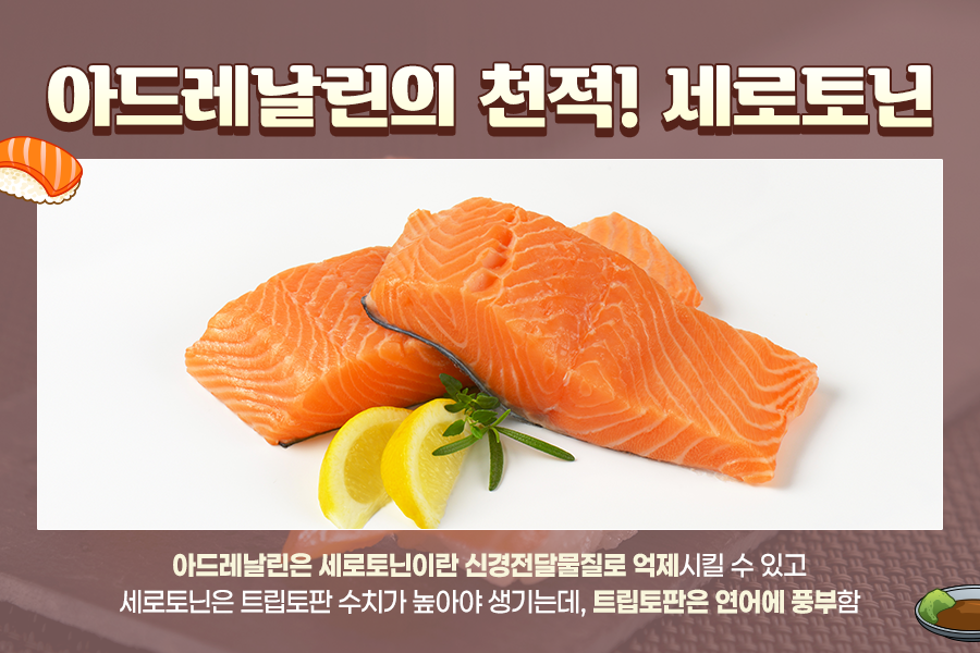 그리고 세로토닌을 만들기 위해선 트립토판 수치가 높아야 하는데요. 트립토판은 연어같은 음식에 풍부하게 함유되어 있습니다. 그래서 연어초밥을 먹으면 화가 서서히 가라앉게 됩니다.