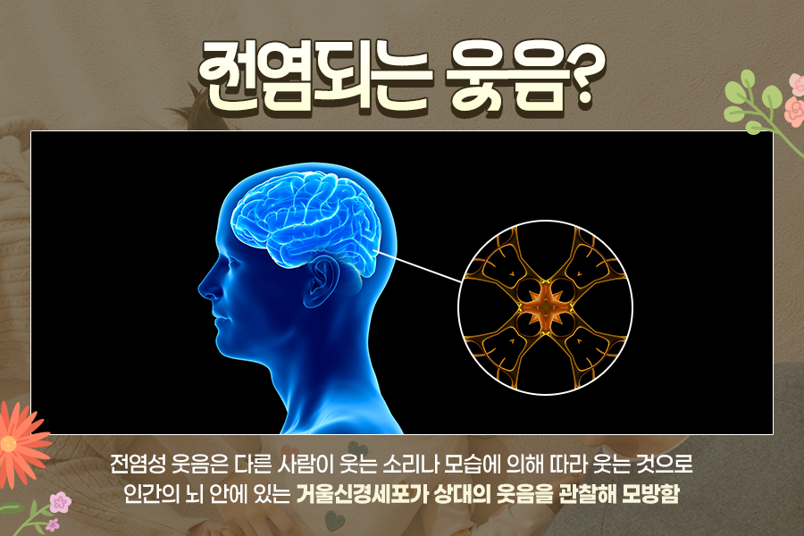 흥미로운 건 웃음이 '전염' 된다는 것인데요. 전염성 웃음은 다른 사람이 웃는 소리나 모습에 의해 자신도 웃게 됩니다. 인간의 뇌에는 거울신경세포가 있는데요. 이 세포가 다른 사람에게서 관찰하는 웃음을 모방하게 만듭니다.