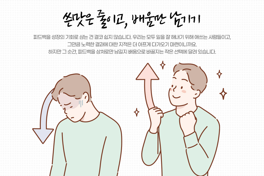피드백을 성장의 기회로 삼는 건 결코 쉽지 않습니다. 우리는 모두 일을 잘 해내기 위해 애쓰는 사람들이고, 그만큼 노력한 결과에 대한 지적은 더 아프게 다가오기 마련이니까요. 하지만 그 순간, 피드백을 상처로만 남길지 배움으로 바꿀지는 작은 선택에 달려 있습니다.