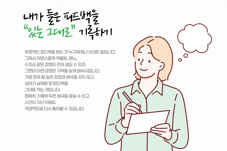 부정적인 피드백을 받는 건 누구에게나 쓰라린 일입니다. 그래서 자연스럽게 억울함, 분노, 수치심 같은 감정이 먼저 생길 수 있죠. 그런데 이런 감정은 기억을 쉽게 왜곡시킵니다. 가장 먼저 할 일은 감정과 해석을 섞지 않고, 상대가 실제로 한 피드백을 그대로 적는 것입니다. 예를 들어 리더는 “PPT 디자인 스킬이 부족하다.”라고만 말했을 뿐인데, 시간이 지나면 내 기억 속에서는 ‘리더가 나더러 PPT를 성의 없이 만들었다고 하셨어.’ 등으로 변질되기 쉽거든요. 정확히 기록해 두면 왜곡을 줄일 수 있고, 시간이 지난 뒤에도 객관적으로 다시 돌아볼 수 있습니다.