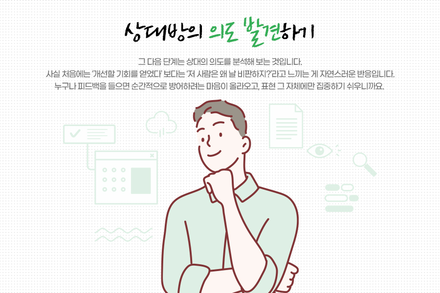 그 다음 단계는 상대의 의도를 분석해 보는 것입니다. 사실 처음에는 ‘개선할 기회를 얻었다’ 보다는 ‘저 사람은 왜 날 비판하지?’라고 느끼는 게 자연스러운 반응입니다. 누구나 피드백을 들으면 순간적으로 방어하려는 마음이 올라오고, 표현 그 자체에만 집중하기 쉬우니까요. 하지만 업무 상황에서 주어지는 피드백은 결국 더 나은 성과를 만들기 위한 목적에서 비롯됩니다. 그렇기 때문에 상대가 왜 그런 말을 했는지, 상대가 그 피드백을 통해 얻고자 했던 것은 무엇일지 생각해 보는 과정이 필요합니다.