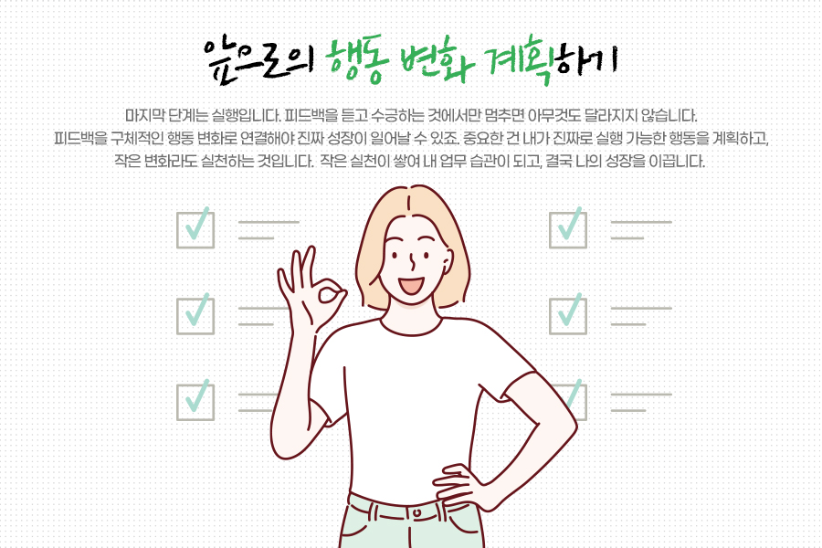 중요한 건 내가 진짜로 실행 가능한 행동을 계획하고, 작은 변화라도 실천하는 것입니다. 작은 실천이 쌓여 내 업무 습관이 되고, 결국 나의 성장을 이끕니다. 이를 통해 피드백이 ‘상처’가 아닌, 나를 움직이게 하는 ‘원동력’이 될 수 있습니다.