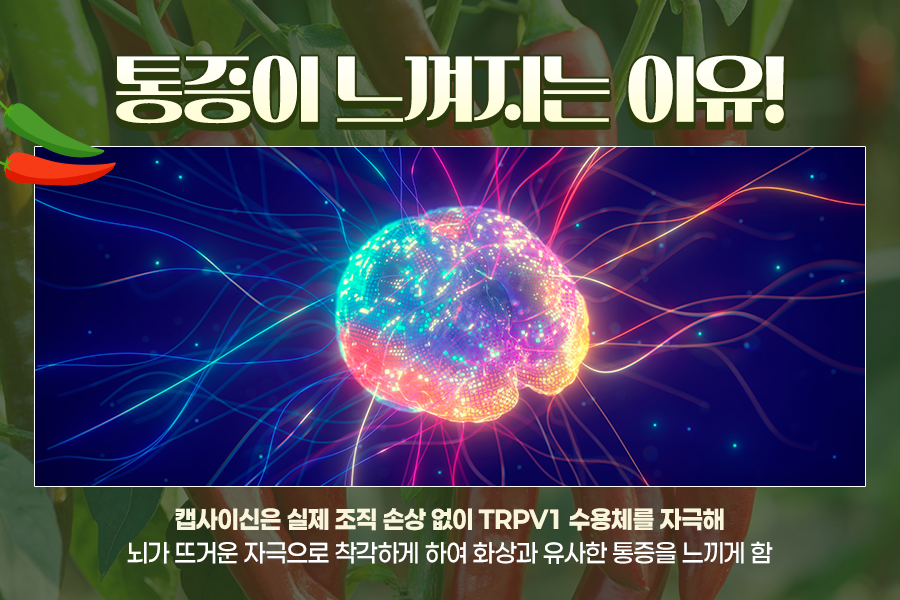 캡사이신이 유발하는 통증은 실제 화상처럼 조직이 손상되는 것이 아닌데요. TRPV1이라는 통증·열 감지 수용체가 활성화되기 때문입니다. 이 수용체는 원래 43℃ 이상의 뜨거운 열이나 산성 자극을 감지하는데, 캡사이신의 성분 때문에 뇌가 ‘뜨겁다’는 신호로 착각해 화상 같은 통증을 느끼게 되는데요.