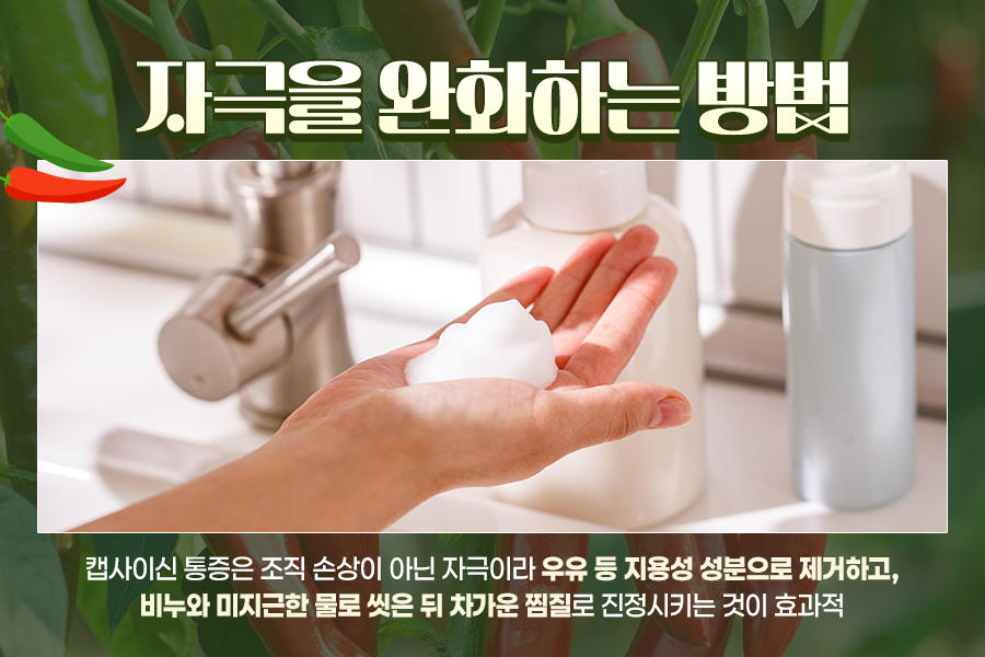 캡사이신으로 인한 통증은 조직이 손상된 것이 아니라 치료보다는 자극 성분을 효과적으로 제거하고 진정시키는 것이 중요합니다.