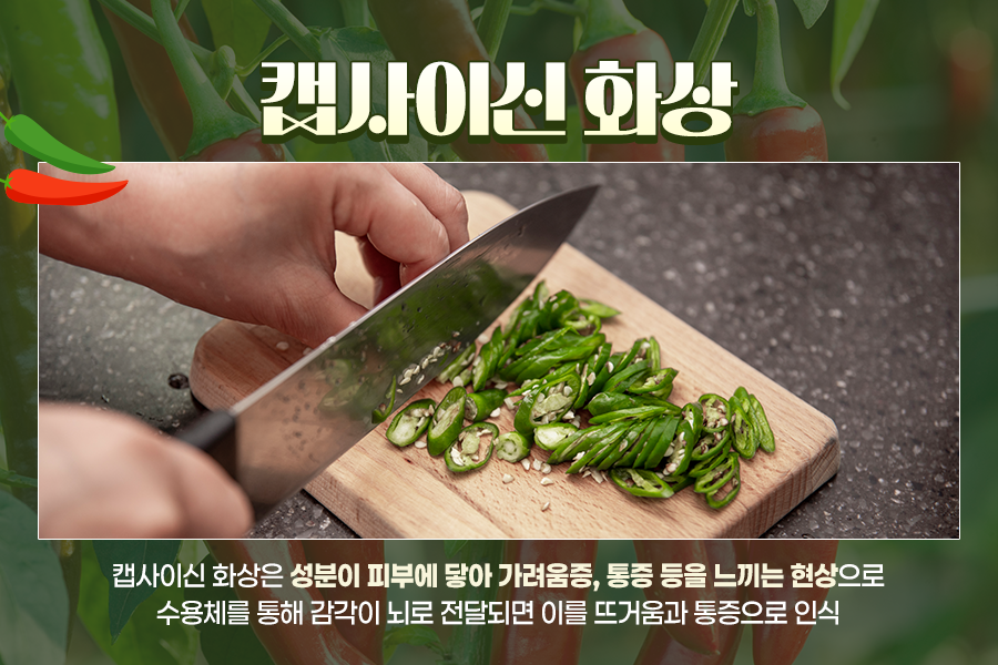 이 증상, 단순히 매운맛을 내는 성분인 줄 알았던 캡사이신의 반란이라고 합니다. 왜 캡사이신 성분이 피부에 닿으면 강한 자극이 일어나는 걸까요? 함께 알아봅시다.