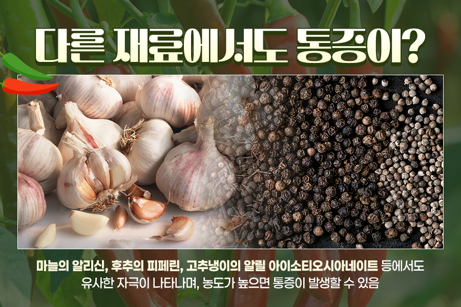 이러한 증상은 고추 속 캡사이신뿐 아니라 마늘의 알리신, 후추의 피페린, 고추냉이(혹은 겨자)의 알릴 아이소티오시아네이트 등에서도 나타나는데요. 캡사이신만큼 강한 반응은 일반적으로 적지만, 성분이 다량 농축되어 있으면 증상이 나타날 수 있습니다.