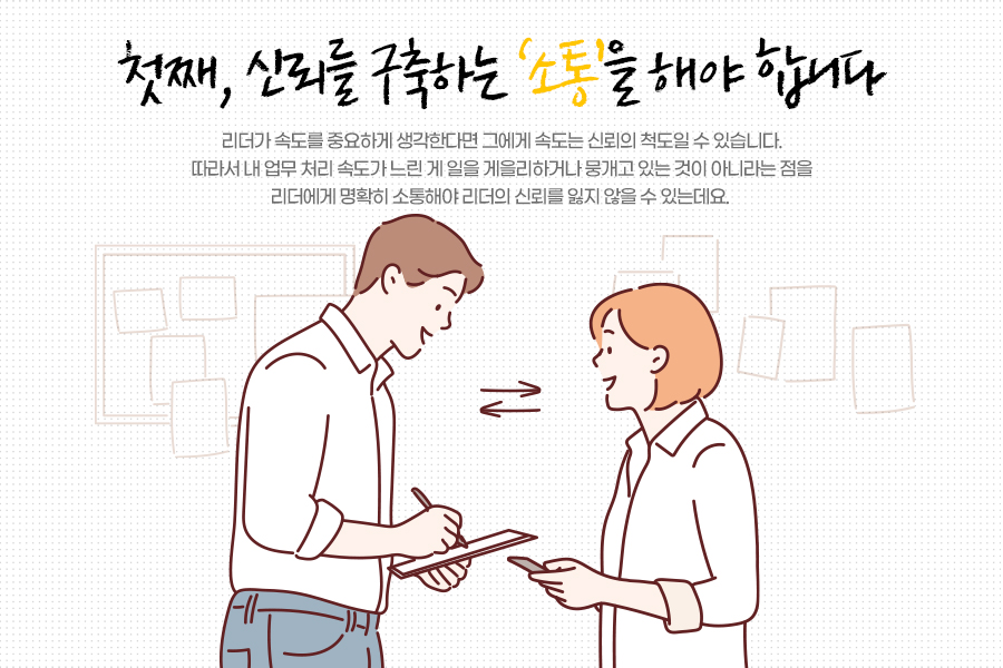리더가 속도를 중요하게 생각한다면 그에게 속도는 신뢰의 척도일 수 있습니다. 따라서 내 업무 처리 속도가 느린 게 일을 게을리하거나 뭉개고 있는 것이 아니라는 점을 리더에게 명확히 소통해야 리더의 신뢰를 잃지 않을 수 있는데요.