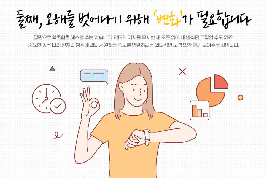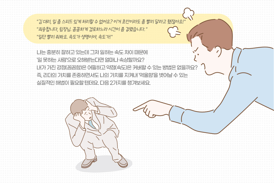 말만으로 억울함을 해소할 수는 없습니다. 리더의 가치를 무시한 채 모든 일에 내 방식만 고집할 수도 없죠. 중요한 것은 나의 일처리 방식에 리더가 원하는 속도를 반영하려는 의도적인 노력 또한 함께 보여주는 것입니다.