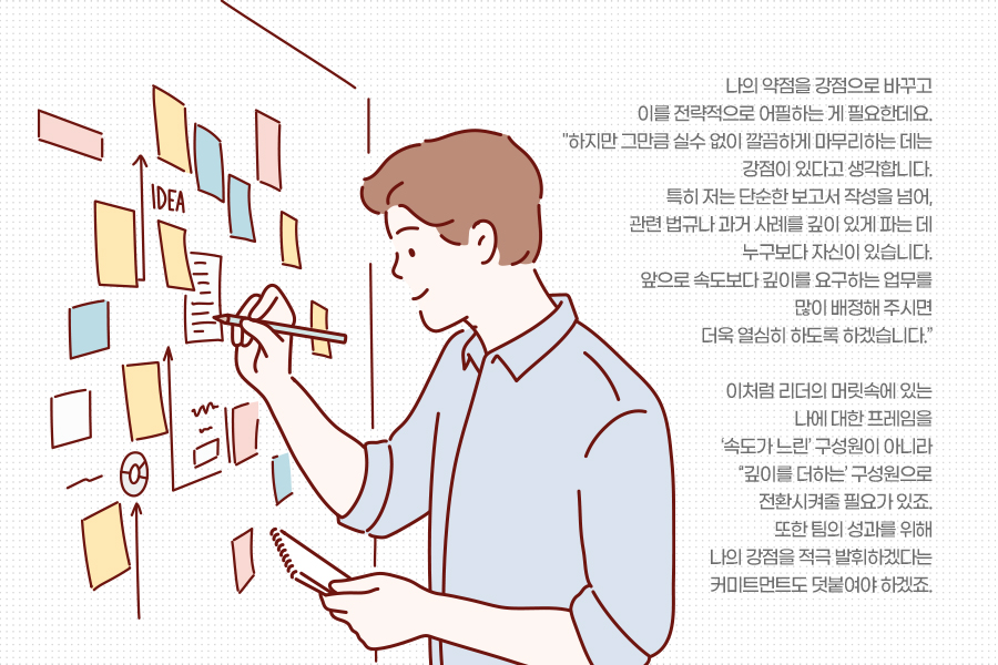 이처럼 리더의 머릿속에 있는 나에 대한 프레임을 ‘속도가 느린’ 구성원이 아니라 ‘'깊이를 더하는’ 구성원으로 전환시켜줄 필요가 있죠. 또한 팀의 성과를 위해 나의 강점을 적극 발휘하겠다는 커미트먼트도 덧붙여야 하겠죠.