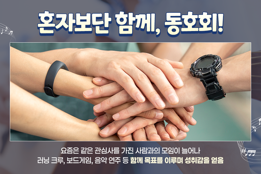 예전에는 혼자 즐기는 취미가 많았다면 요즘은 같은 관심사를 가진 사람과의 모임이 늘어나고 있는데요. 러닝도 혼자보다는 러닝 크루를 만들거나 보드게임, 음악 연주 등 다 함께 시간과 장소를 정해 취미를 즐기곤 합니다.
