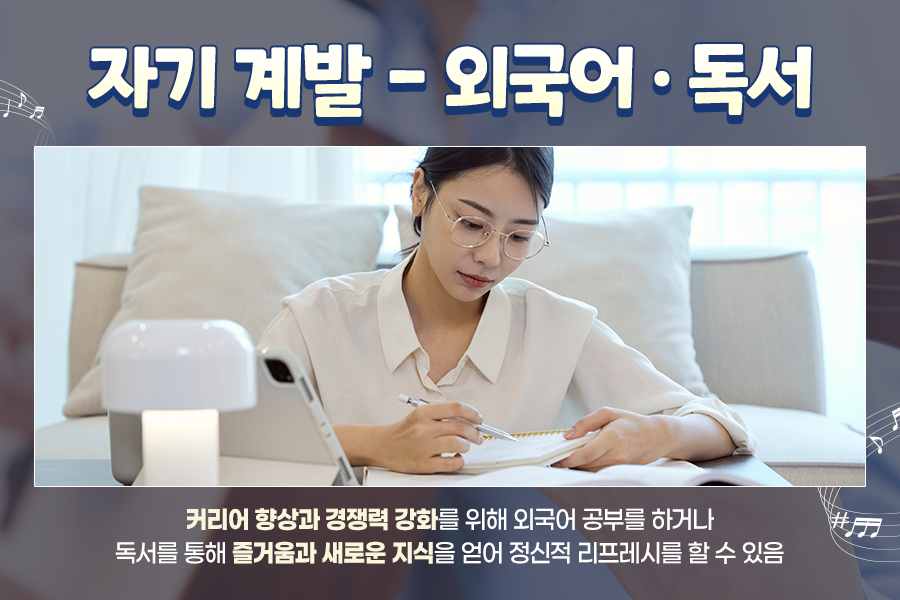 자기 계발 취미로는 외국어 공부가 있는데요. 한 조사에 따르면 직장인 10명 중 7명이 외국어 학습에 관심이 있으며, 대부분 커리어 향상과 경쟁력 강화를 위해 배우고 싶다고 답했습니다. 그래서 출근 전/후 시간을 활용해 취미를 이어가는 사람들이 많죠.