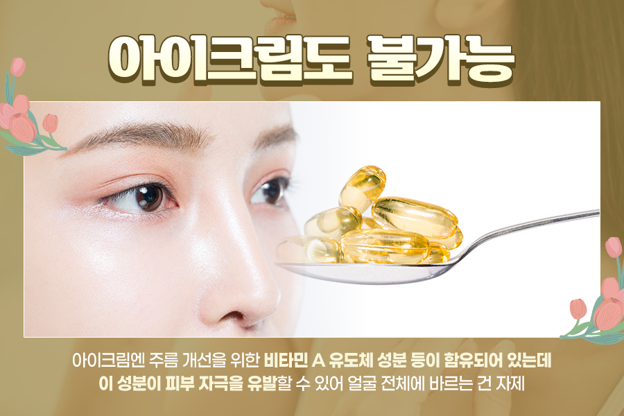 아이크림에는 주름 개선을 위해 비타민 A 유도체 성분 등이 포함되어 있는데 이 성분이 피부 자극을 유발할 수 있어 전체에 바르는 건 자제해야 하죠. 결국 신체 부위 별로 정해진 크림은 그 용도에 따라 사용하는 것이 좋습니다.
