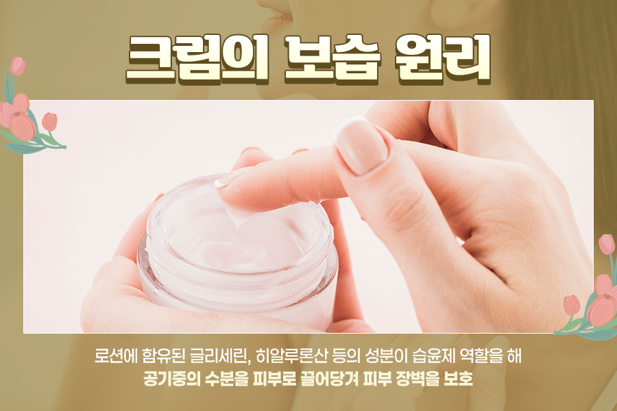 이럴 땐 피부에 로션을 발라 수분을 공급해 주어야 하는데요. 로션에 포함된 글리세린, 히알루론산 등의 성분이 습윤제 역할을 해 공기 중의 수분을 피부로 끌어당깁니다. 그래서 촉촉한 느낌이 드는 것이죠.