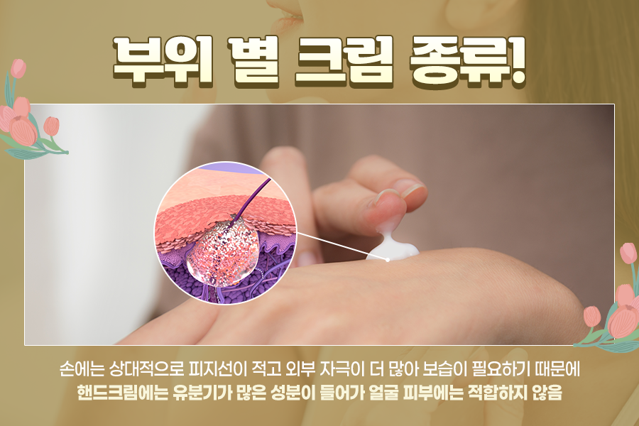 그렇다면 핸드크림도 얼굴에 바르면 수분을 채워줄 수 있을까요? 핸드크림은 손 보습 전용 제품이기 때문에 다른 부위 화장품과는 성분이 다릅니다. 피지선 분포에 차이가 있기 때문인데요.