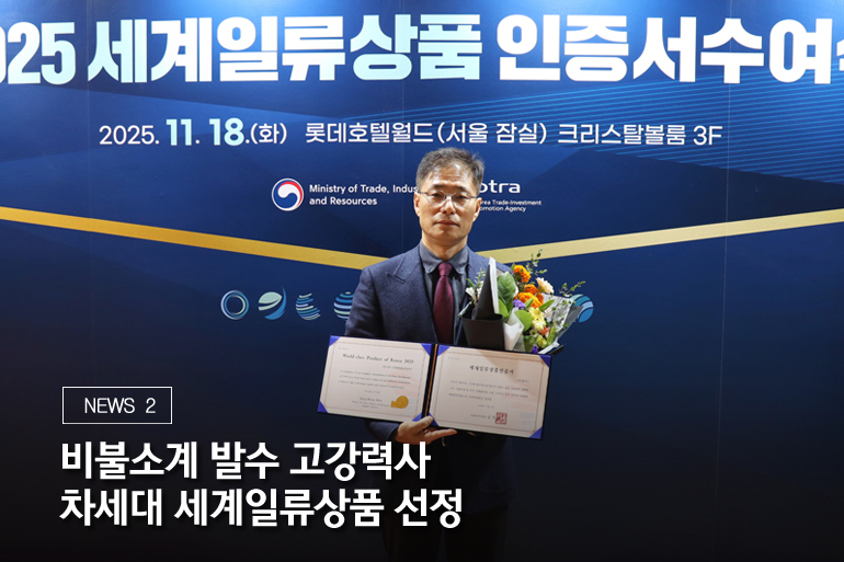 지난 11월 18일, 산업통상자원부가 주최하고 KOTRA(대한무역투자진흥공사)가 주관하는 ‘2025년도 세계일류상품 인증서 수여식’에서 휴비스의 '비불소계 발수 고강력사'가 차세대 세계일류상품으로 선정됐습니다. 이로써 휴비스는 세계일류상품 8개, 차세대 세계일류상품 8개 등 총 16개의 세계일류상품을 보유하게 되었습니다.