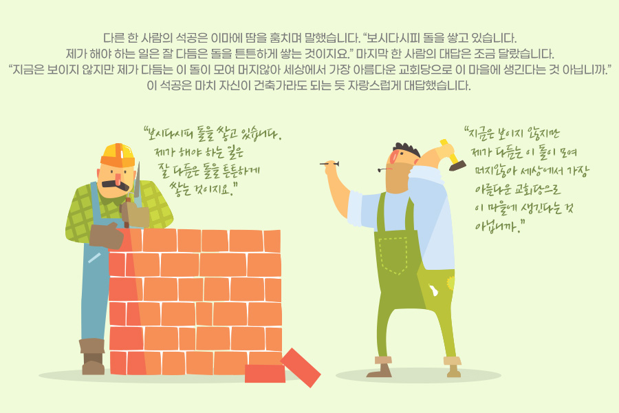 다른 한 사람의 석공은 이마에 땀을 훔치며 말했습니다. “보시다시피 돌을 쌓고 있습니다. 제가 해야 하는 일은 잘 다듬은 돌을 튼튼하게 쌓는 것이지요.” 마지막 한 사람의 대답은 조금 달랐습니다. “지금은 보이지 않지만 제가 다듬는 이 돌이 모여 머지않아 세상에서 가장 아름다운 교회당으로 이 마을에 생긴다는 것 아닙니까.” 이 석공은 마치 자신이 건축가라도 되는 듯 자랑스럽게 대답했습니다.